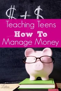 teaching-teens-how-to-manage-money Pink piggy bank with glasses standing on books next to a blackboard with simple money math. Sharp focus on the piggy bank.